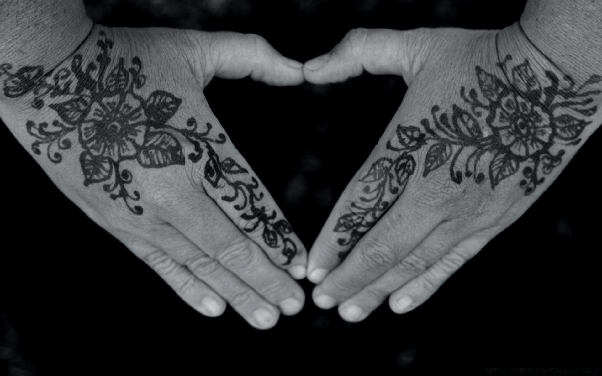 Hands of a woman with stuffed tattoos symbolism black and white photo - desktop wallpapers