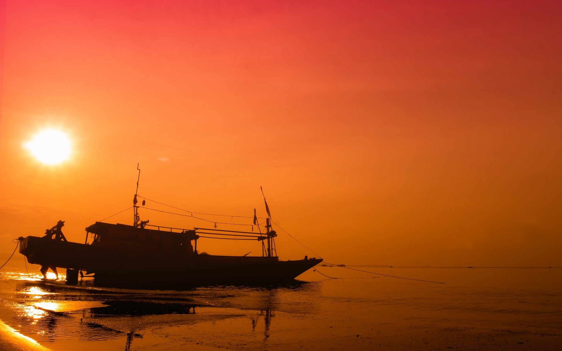 sea and ocean sunset dawn water sea ocean beach sun backlit dusk silhouette evening watercraft fisherman boat seashore seascape sky reflection transportation system