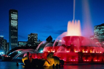 City fountain lights among skyscrapers