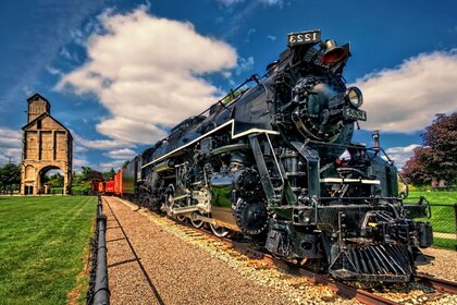 A steam train at the station and the sky with charming clouds