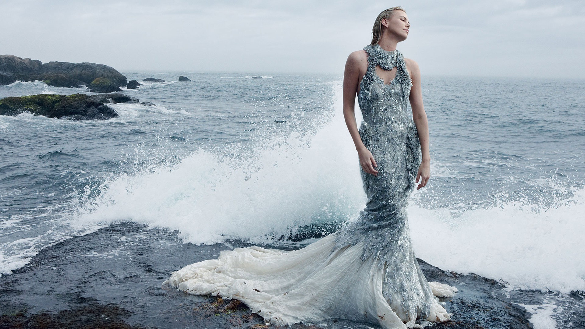 Pretty woman in a chic dress by the ocean