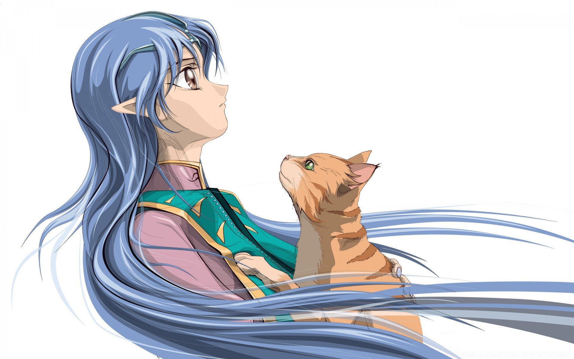 A girl with blue hair and a red cat