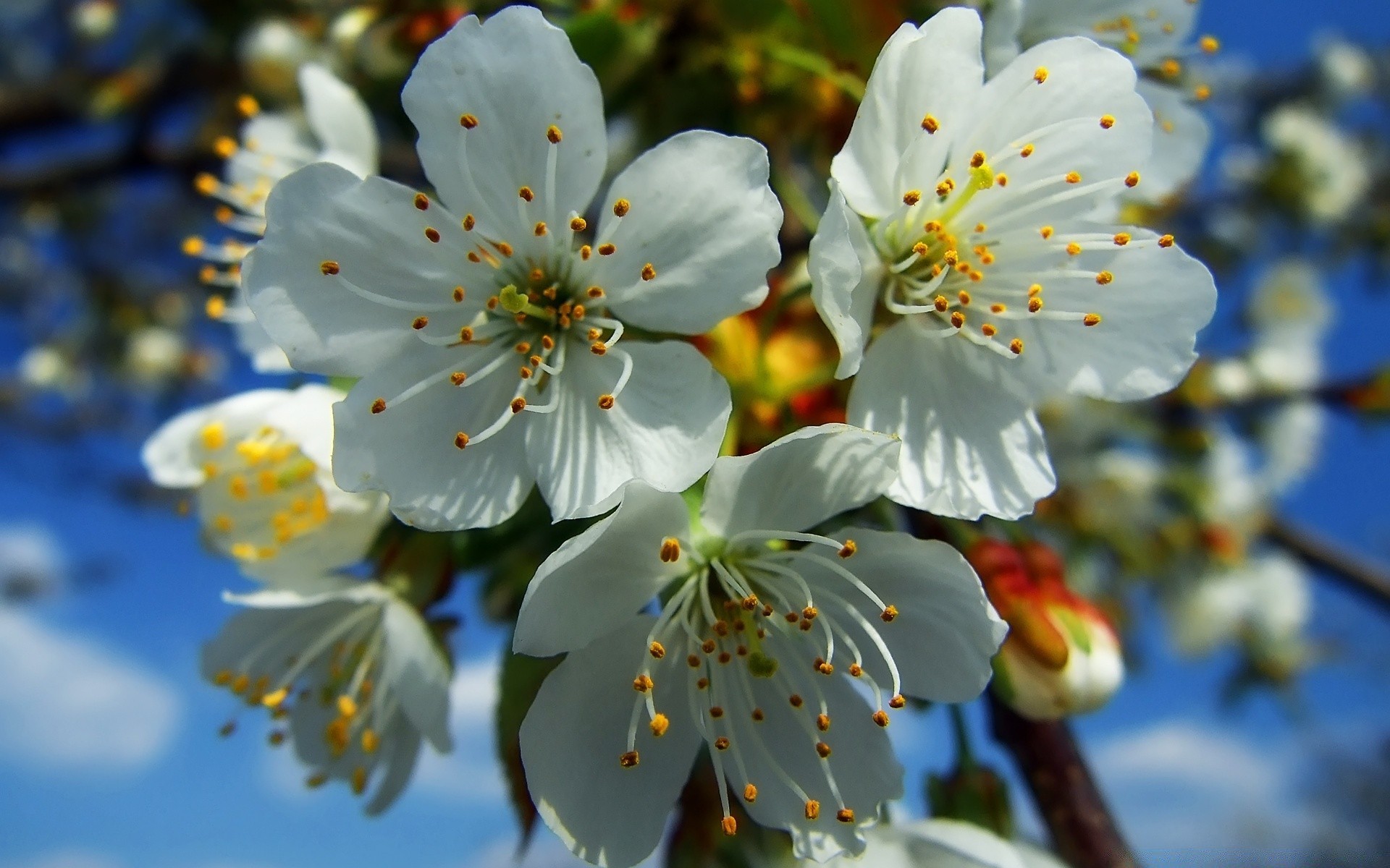 White flowers with five petals three flowers in the foreground blurred background in the background blue sky with cloudsWhite flowers with five petals three flowers in the foreground blurred background in the background blue sky with clouds