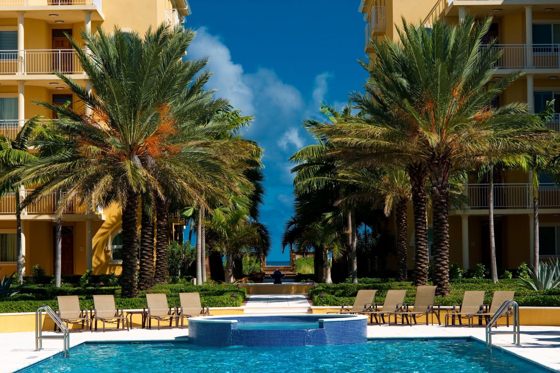 Hotel. Swimming pool. Palm trees. Deck chairs. The sun. Vacation