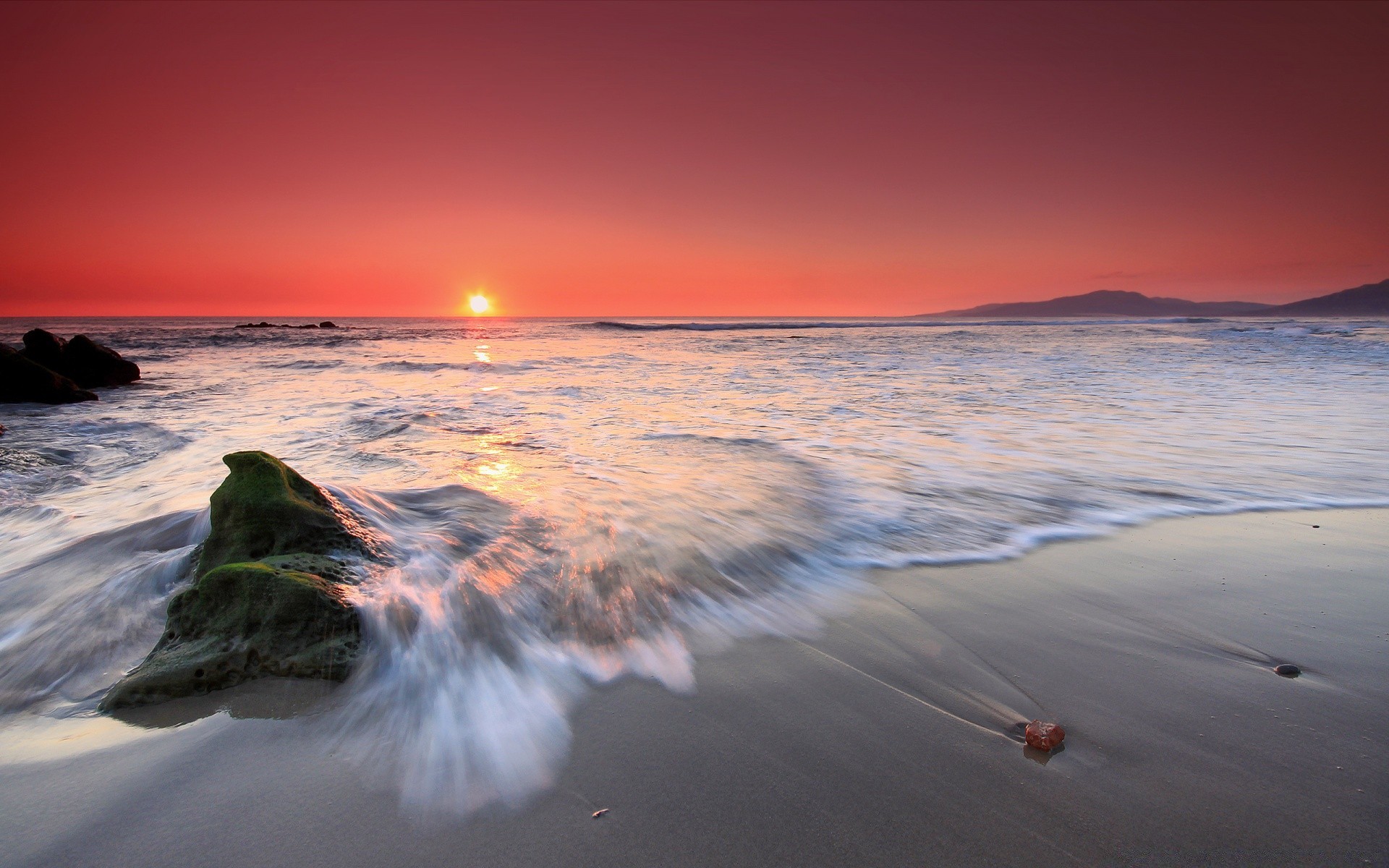 Beautiful landscape with mountains and green trees on both sides of the sea at sunset