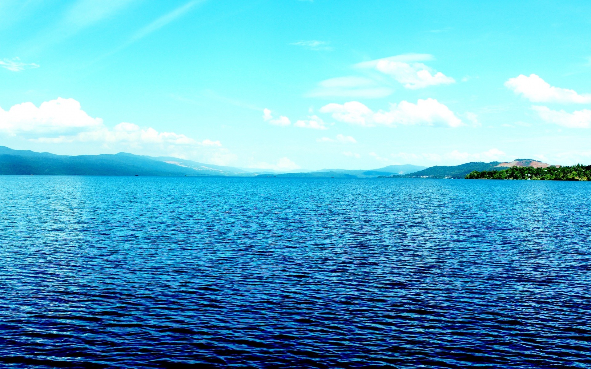 The bridge over the sea goes into the clouds. Blue sky. Yellow sand