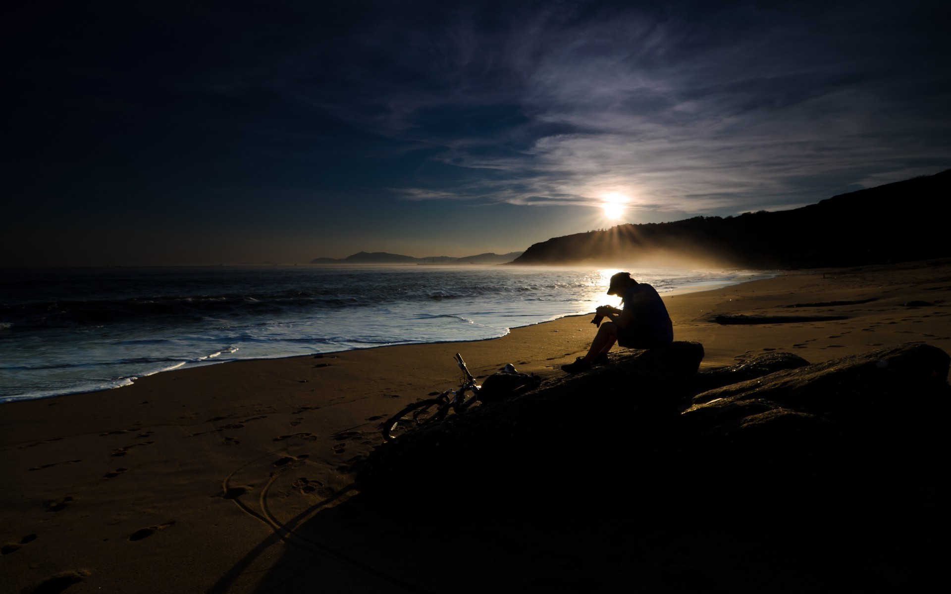 The traveler by the sea is illuminated by the dim rays of the sun behind the mountain