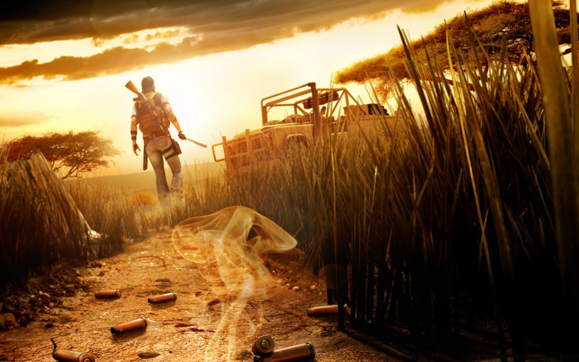 The hero of the game Farcry 4 in full combat gear leaves on the way to his jeep against the background of the sunset sky