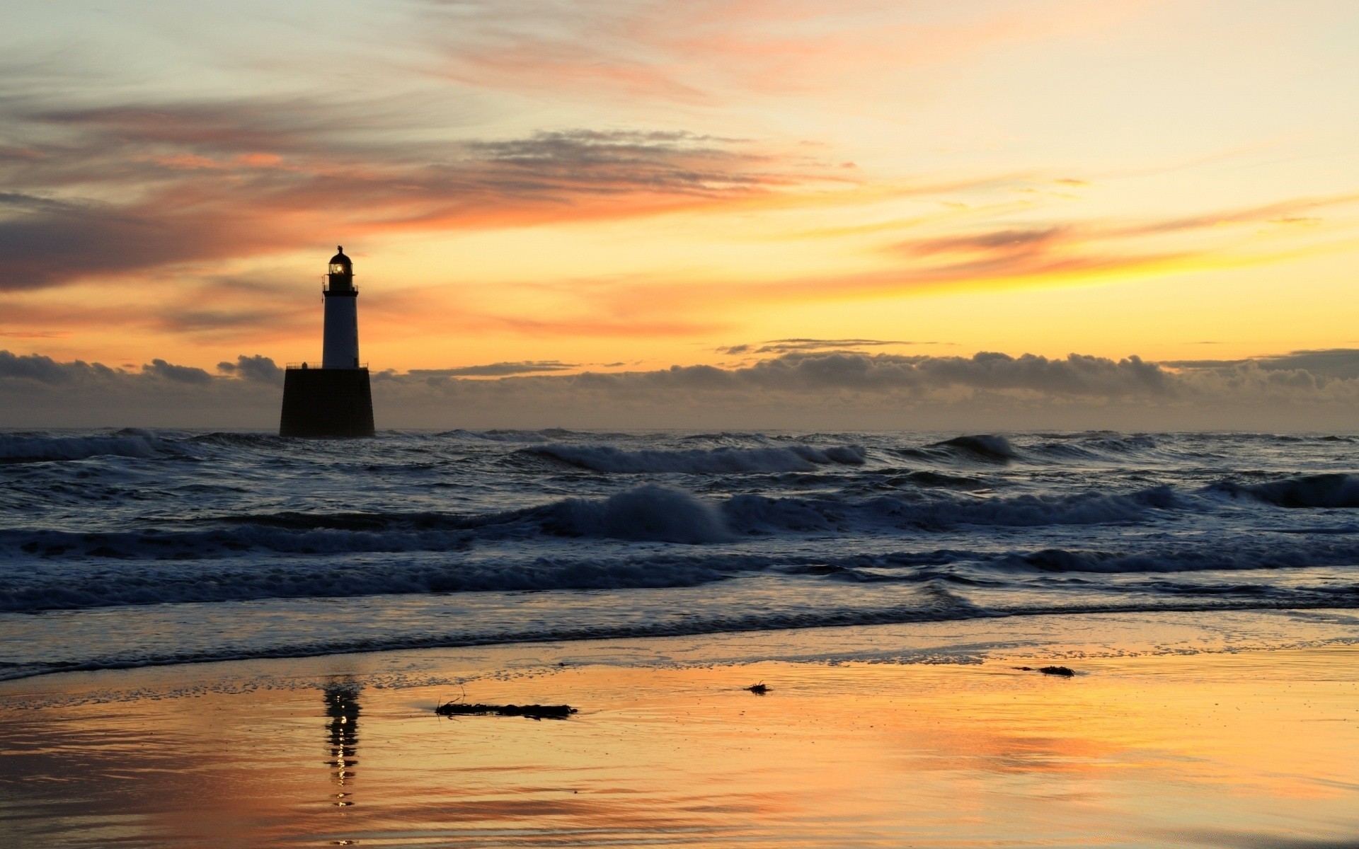 Lighthouse on a rock above the sea in the red light of the departing sun