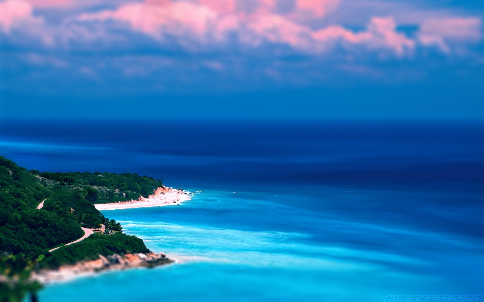 A paradise island in the sea under a blue sky with pink clouds