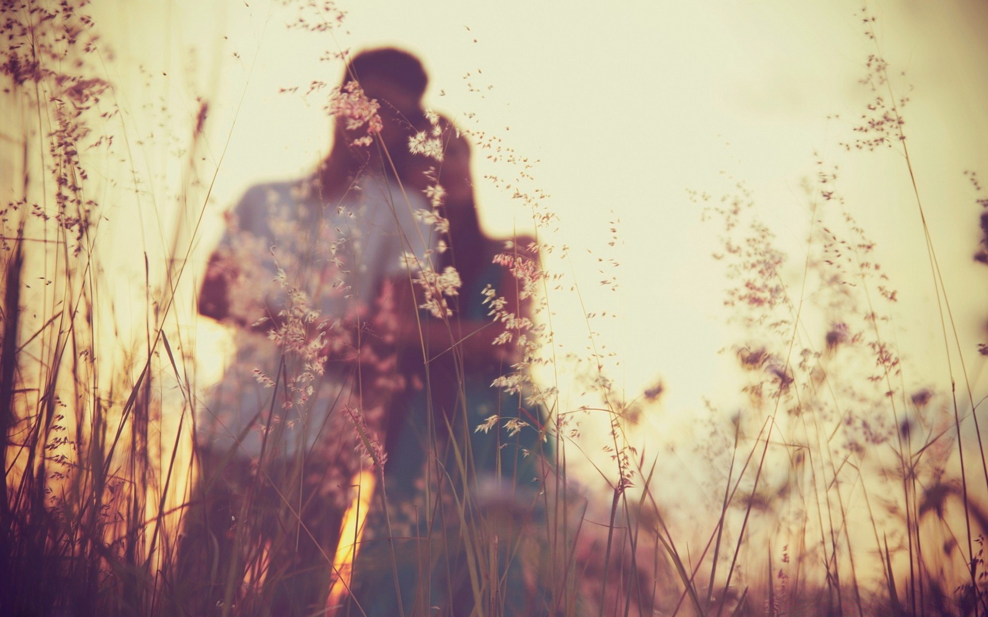 Romantic couple standing with their backs to the camera in a field