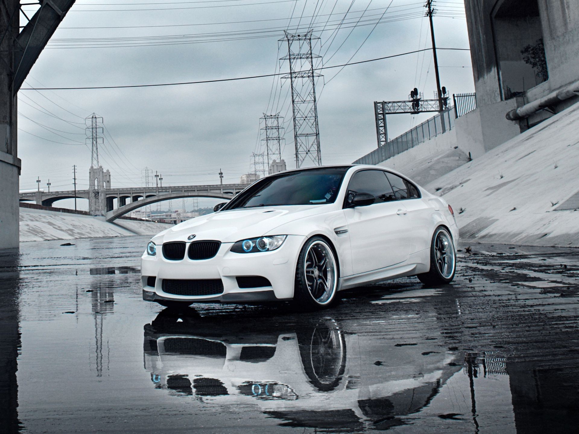 A sporty white car is reflected in a puddle