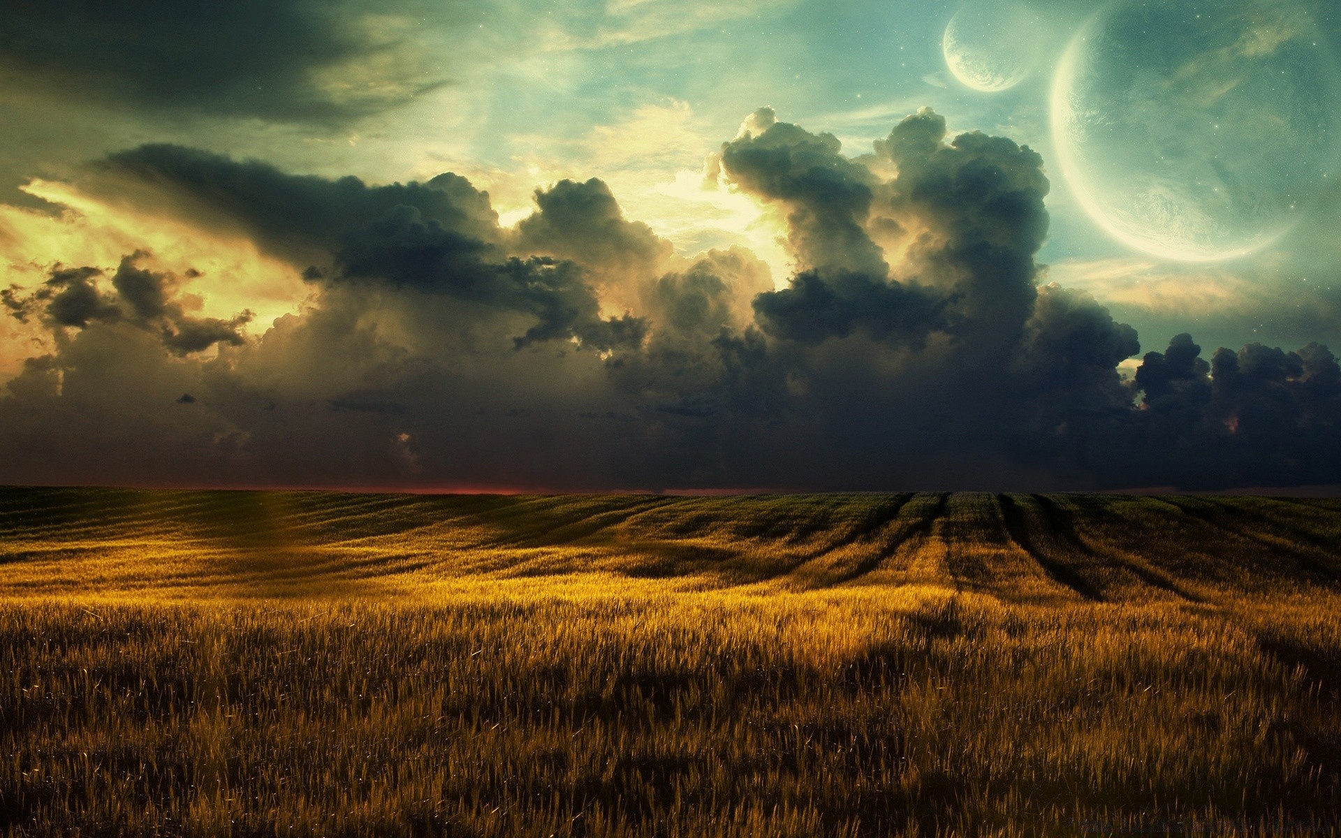 Field in cloudy weather. the sun's rays illuminate the field through the storm cloudsField in cloudy weather. The sun's rays illuminate the field through the storm clouds