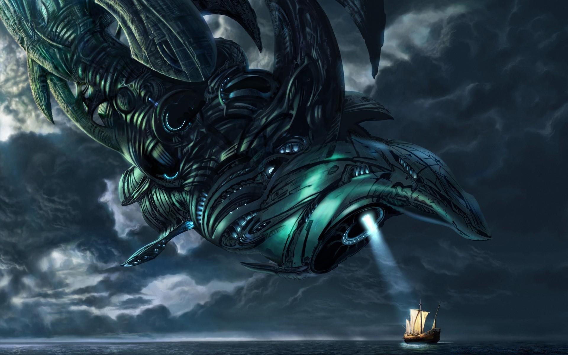 A spaceship against a background of gray clouds