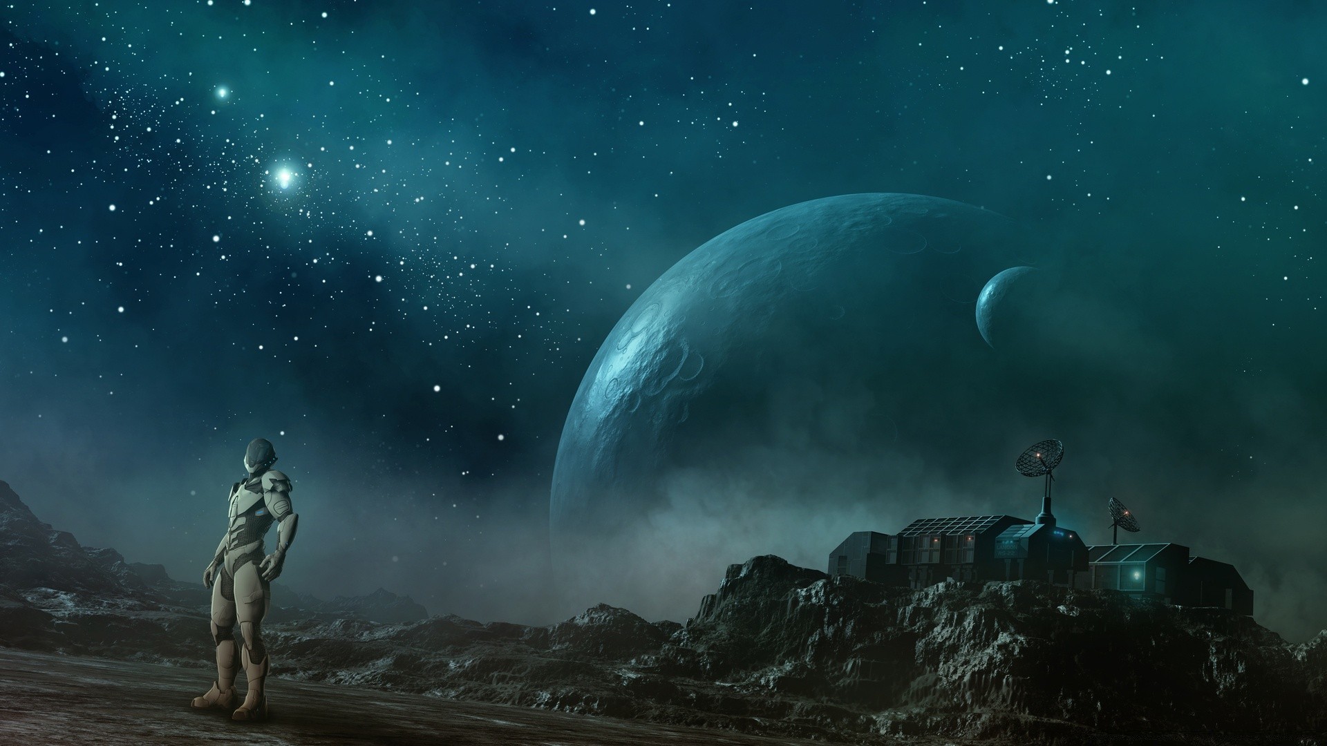 The cosmonaut stands against the background of planets and the starry skyThe cosmonaut stands against the background of planets and the starry sky