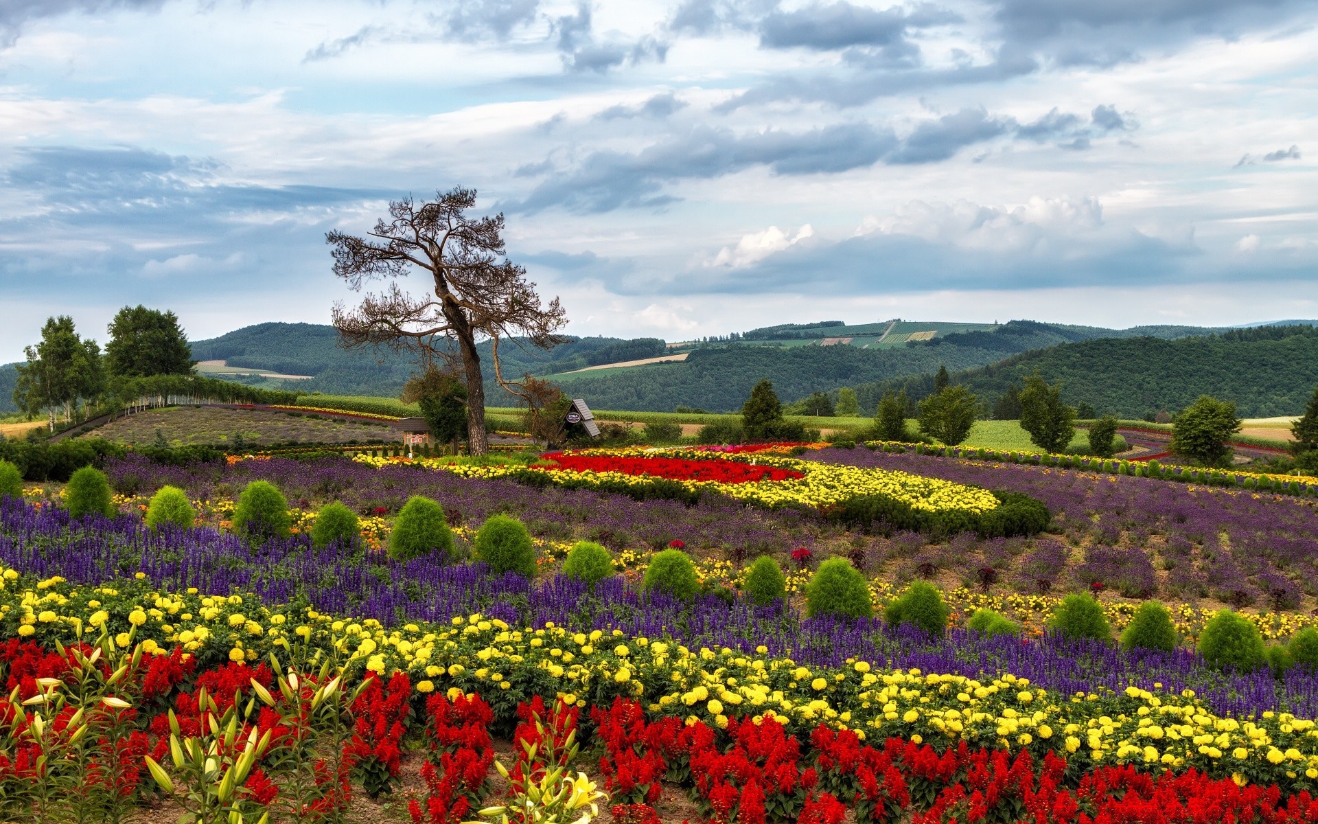 A beautiful garden of flowers in which there is a treeA beautiful garden of flowers in which there is a tree