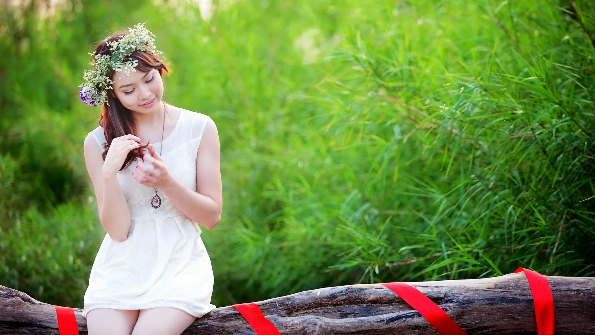 A girl in a white dress with flowers in her hair