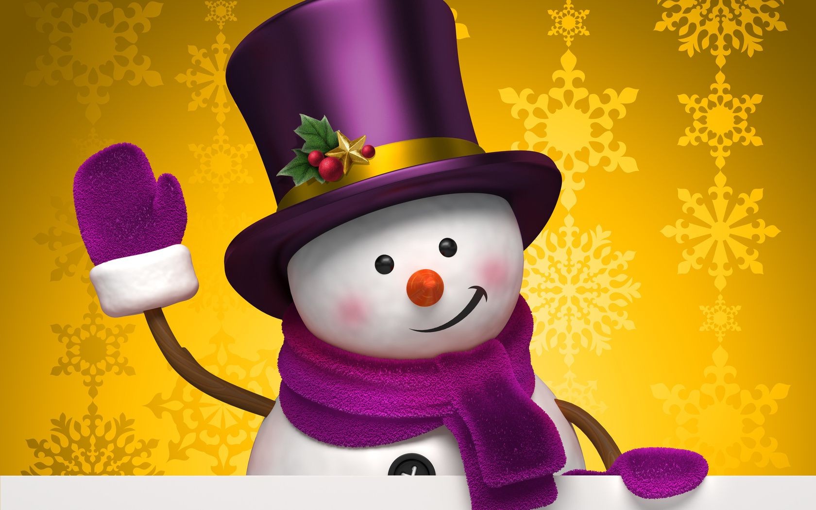 New Year. The snowman is smiling in a hat and scarf. The snowman waves his mittened hand