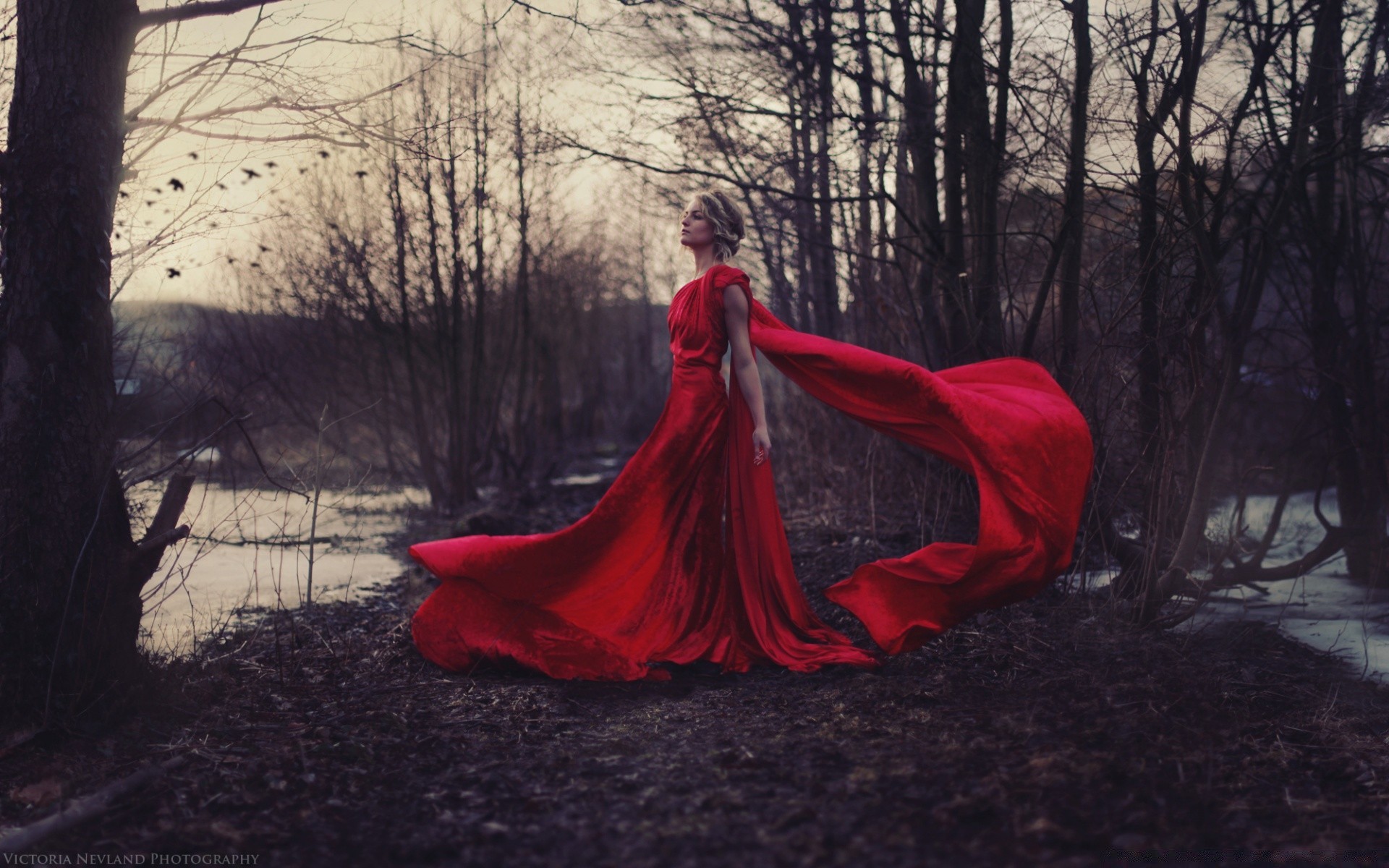 A girl in a red dress against the background of a forest in late autumn