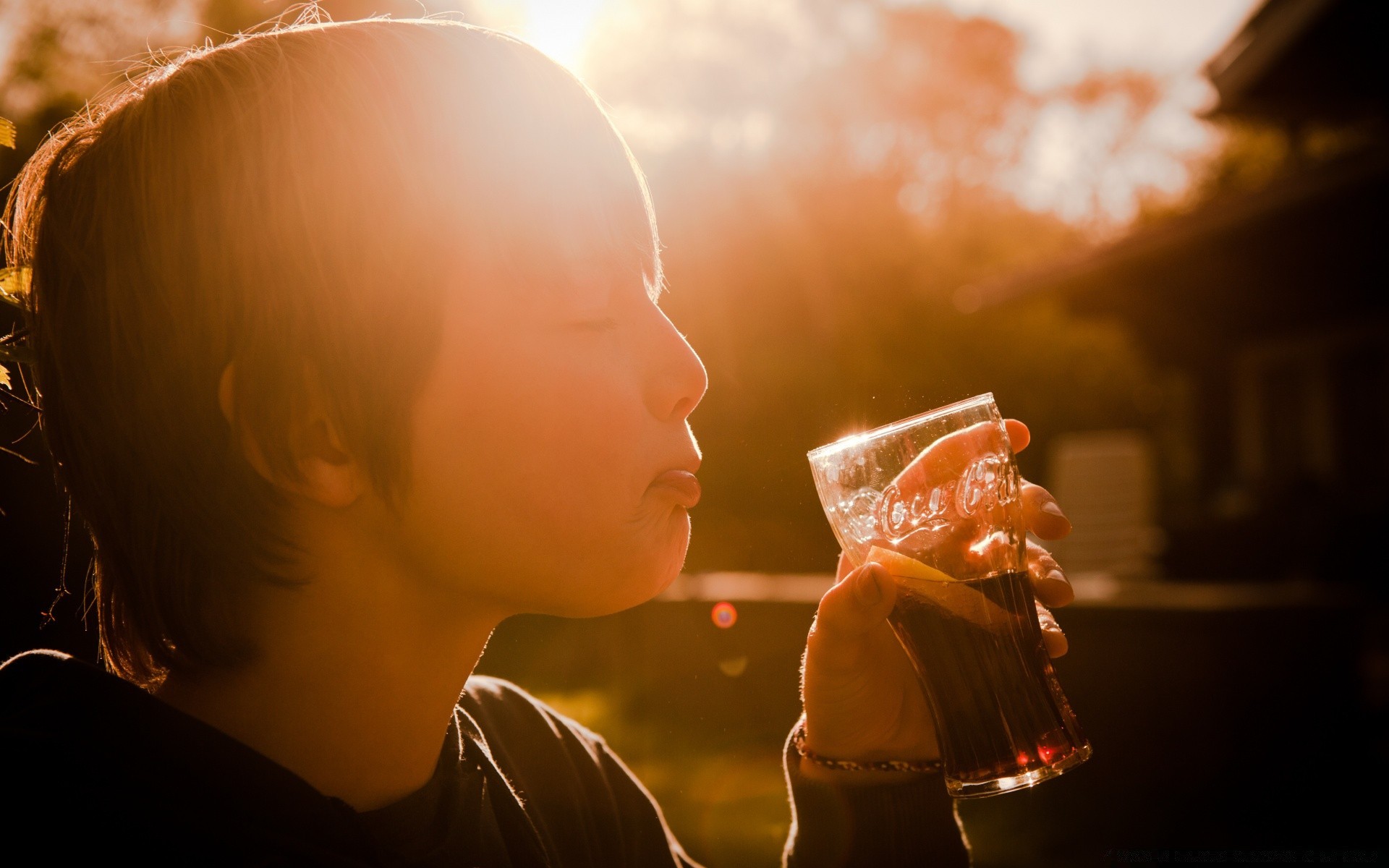 A child with his eyes closed with pleasure . drinking a drink from a glass