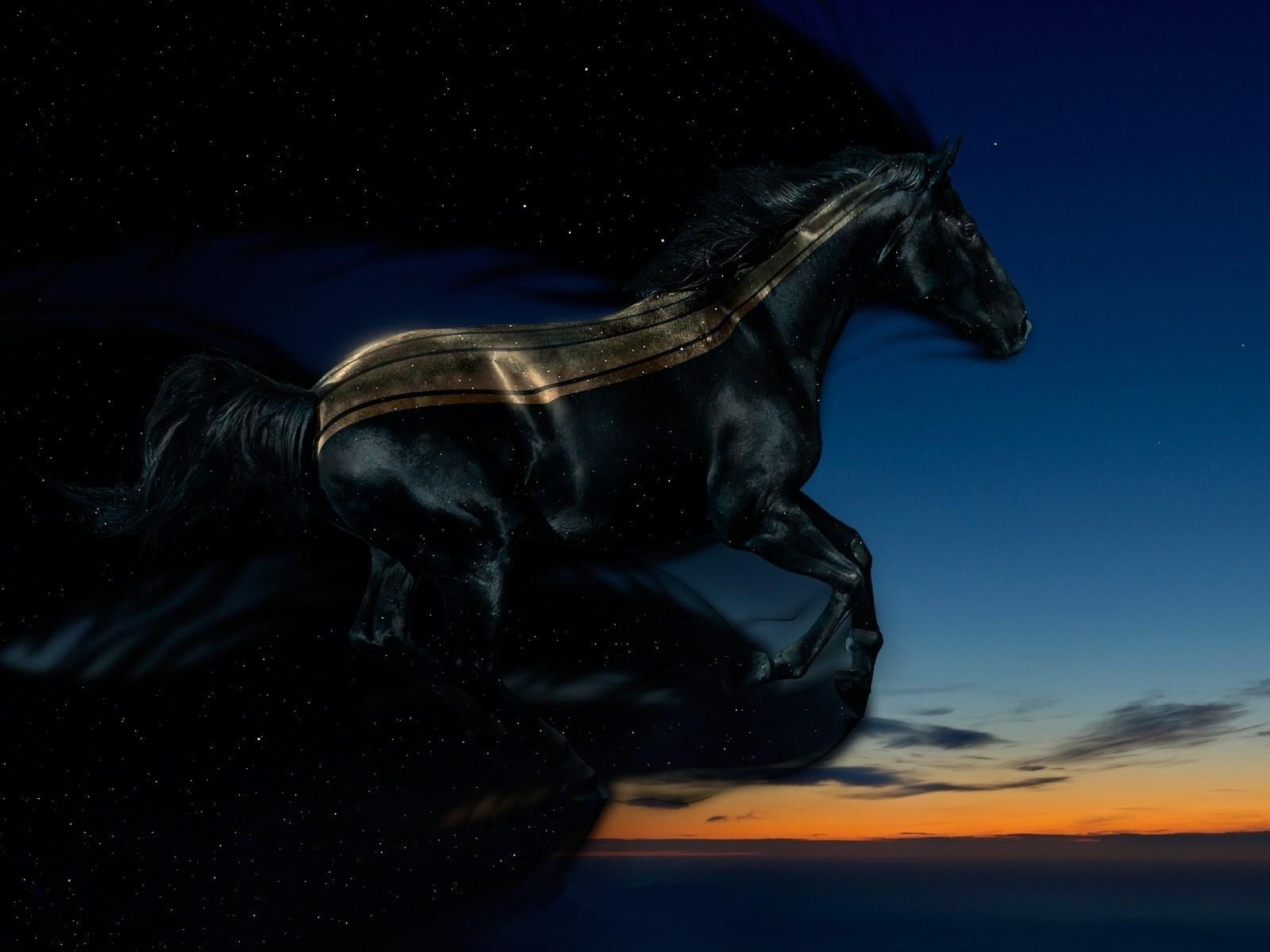 A black horse in motion at sunset
