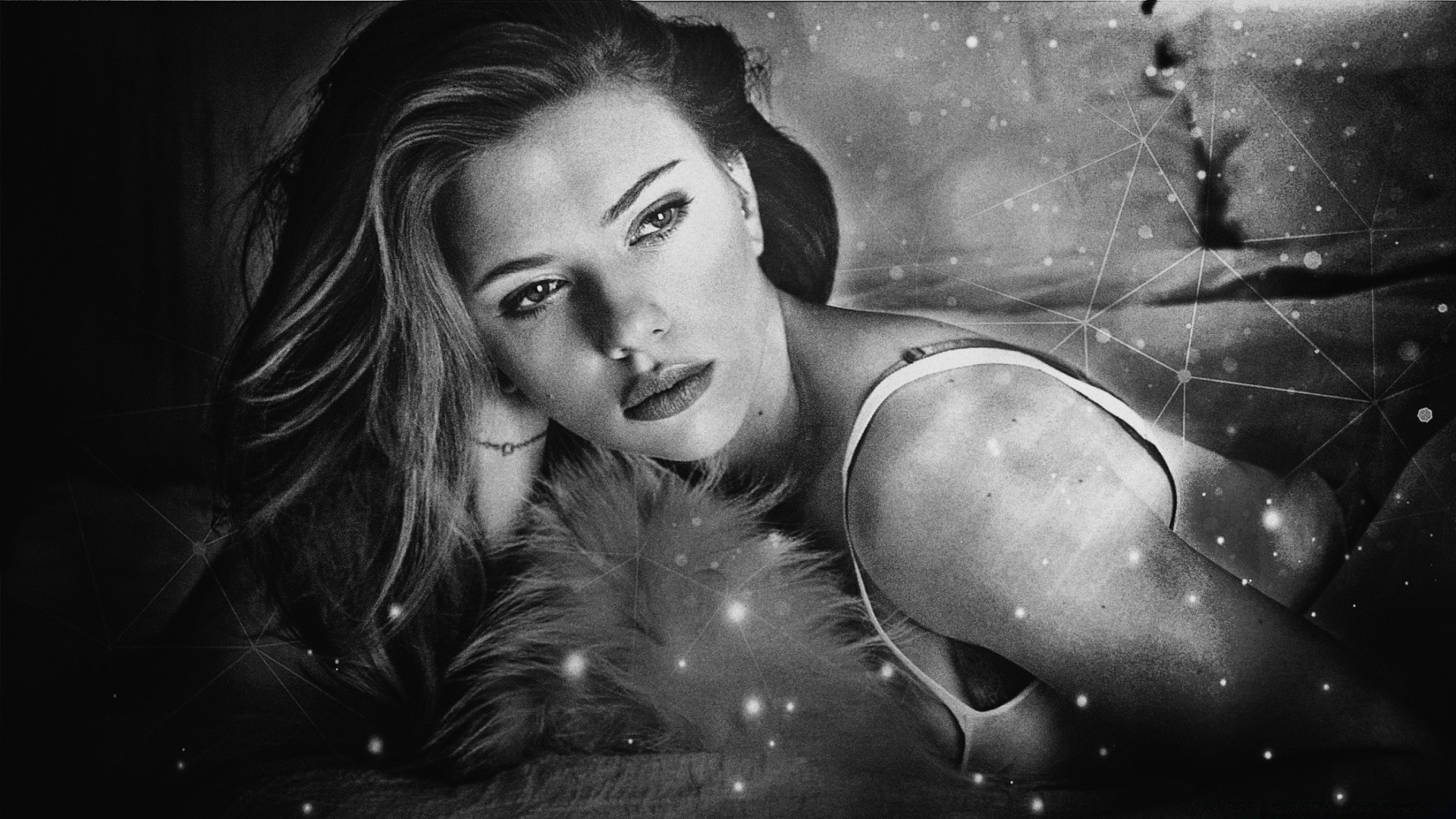 Monochrome portrait of a girl in stars on a black background