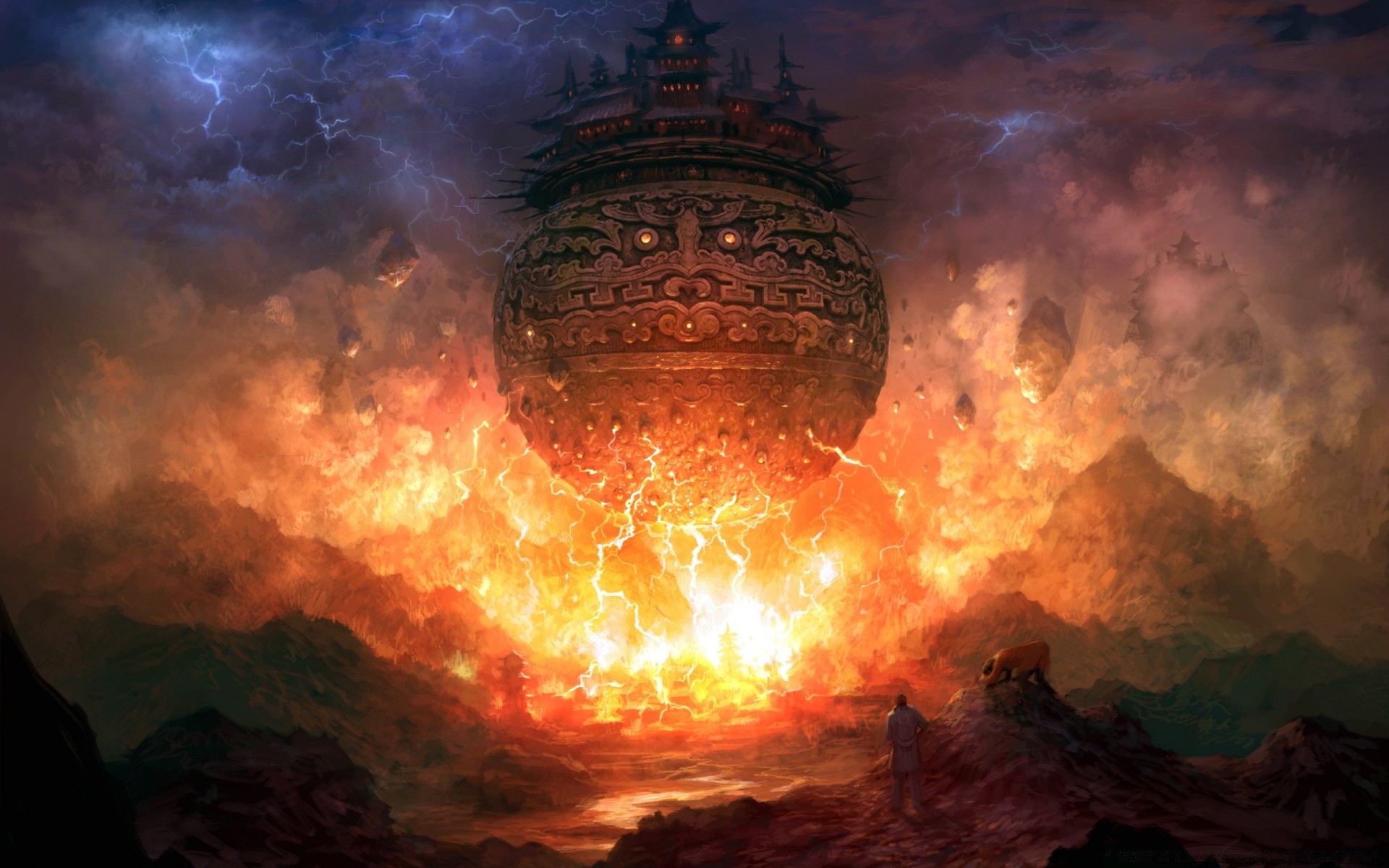 A flying ship releasing lightning