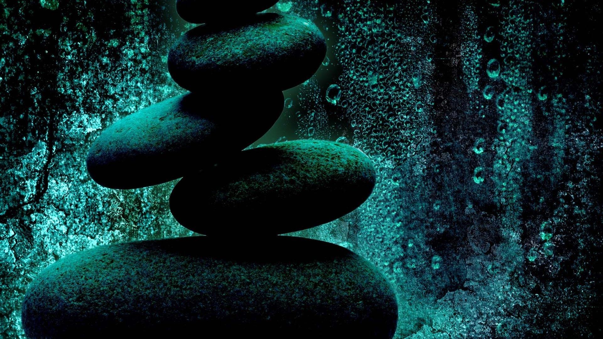 The rocky shore against the background of a clear sky is reflected in the waters of the river