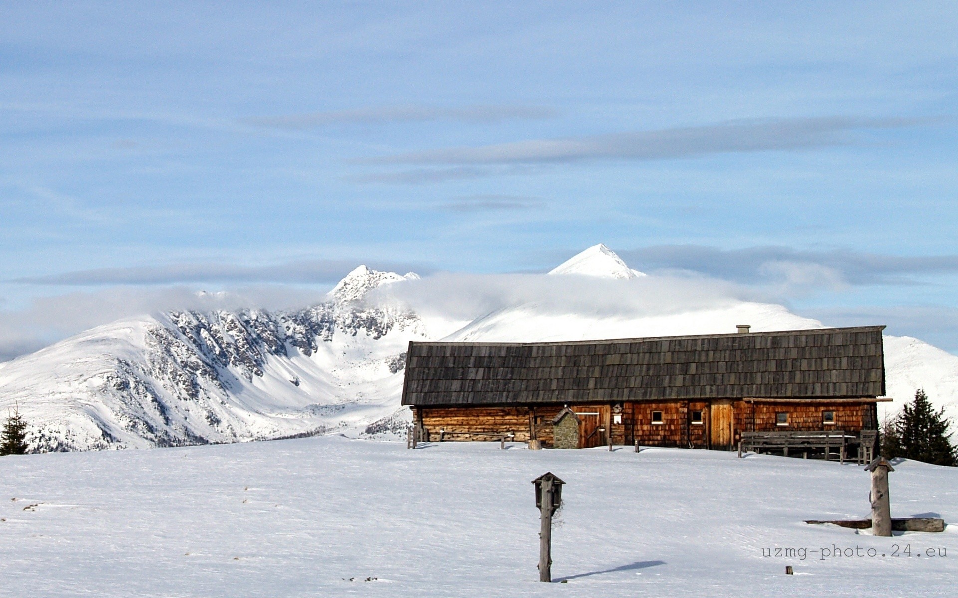 Black and white photo shows a lynx winter on the background of a house and a tree