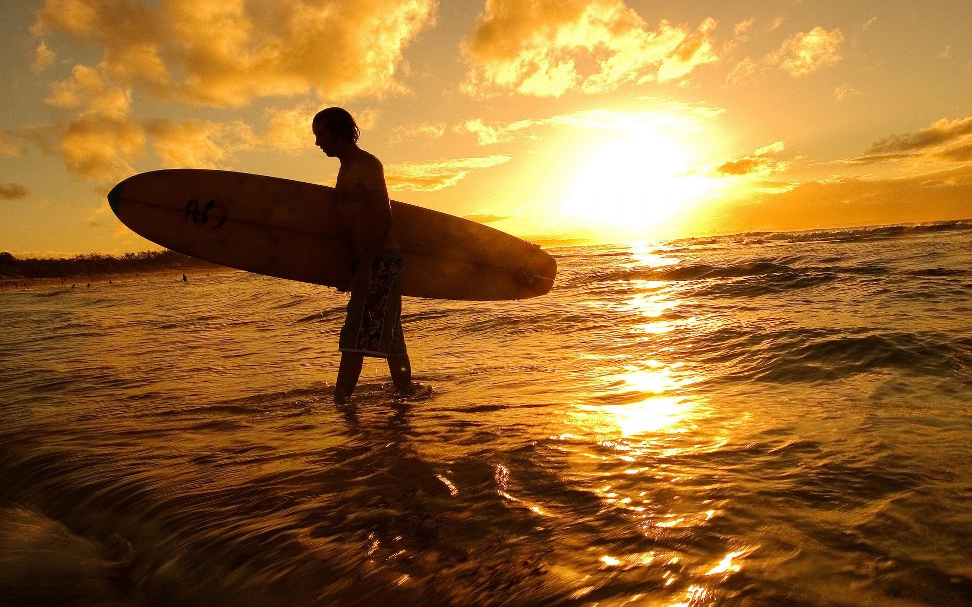 A surfer with a board comes out of the ocean against the background of the setting sun