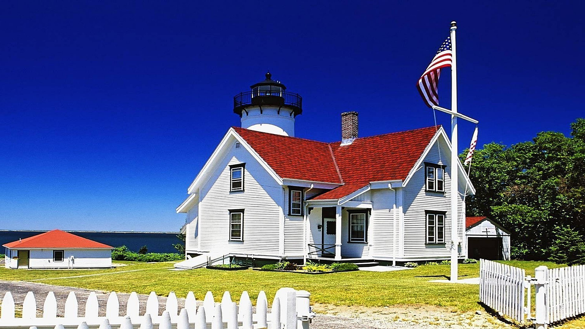 Multicolored umbrellas hang over the street between buildings against a blue sky background
