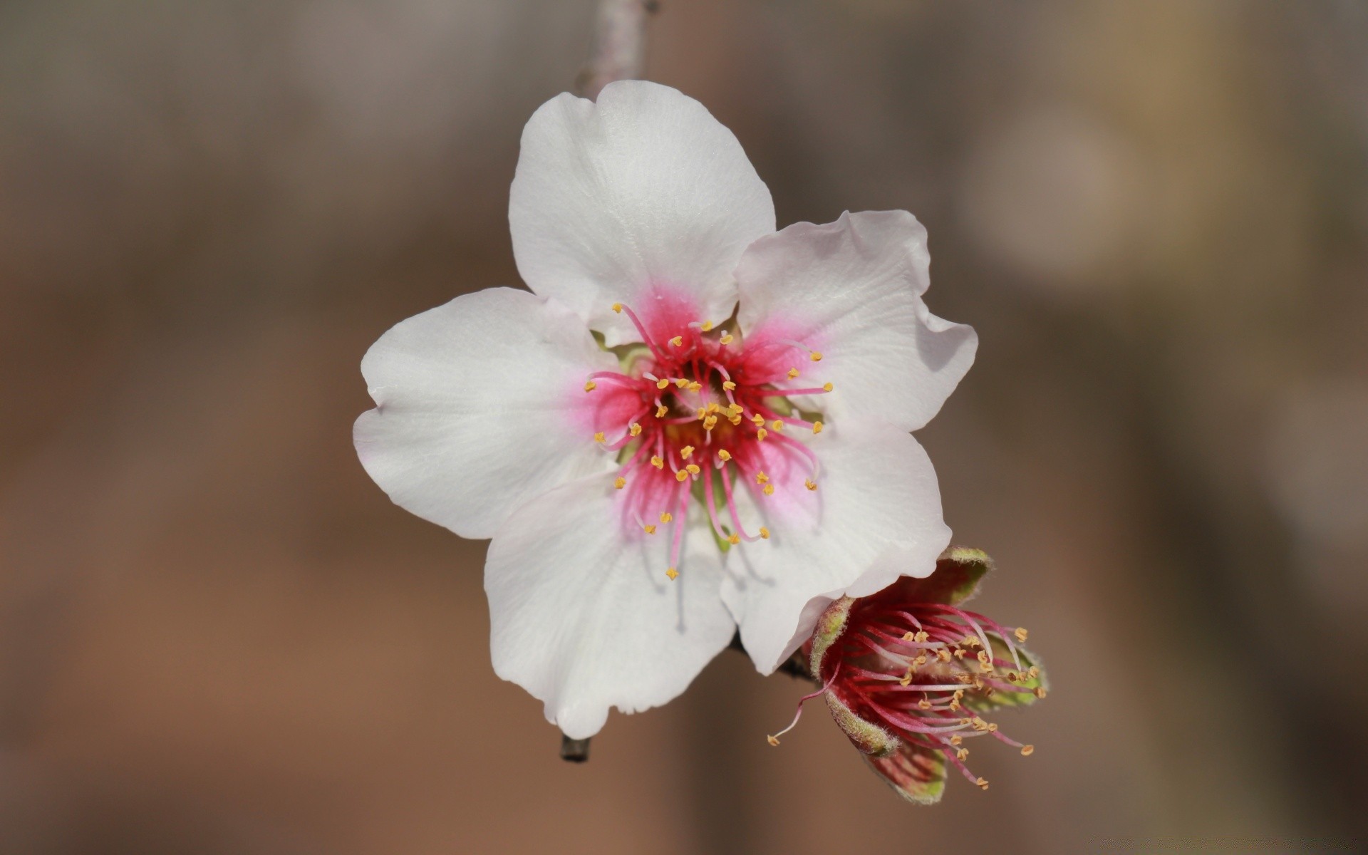 Macro shooting. Pink delicate flower on a branch