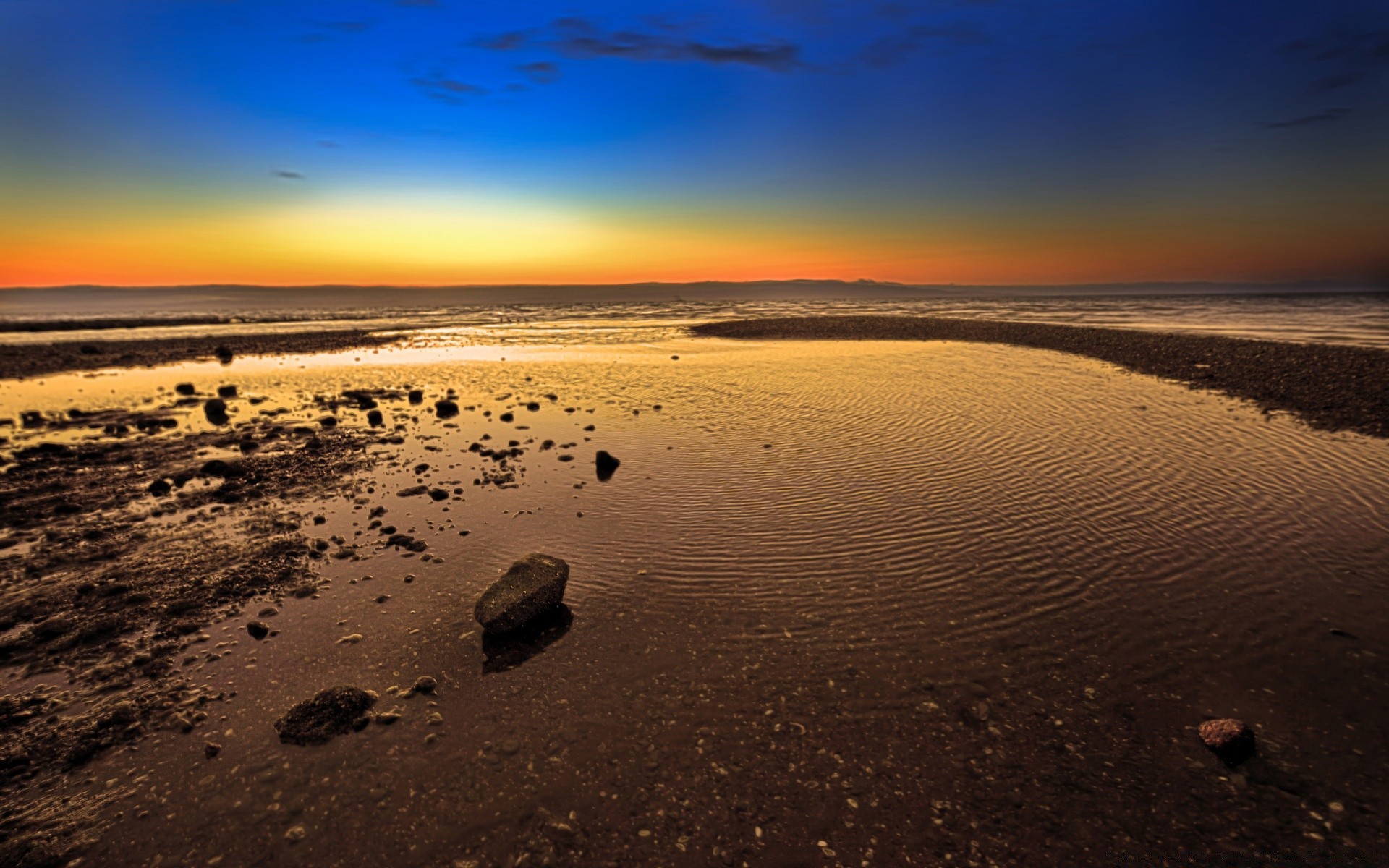 Evening beach, illuminated by the last rays of the setting sun