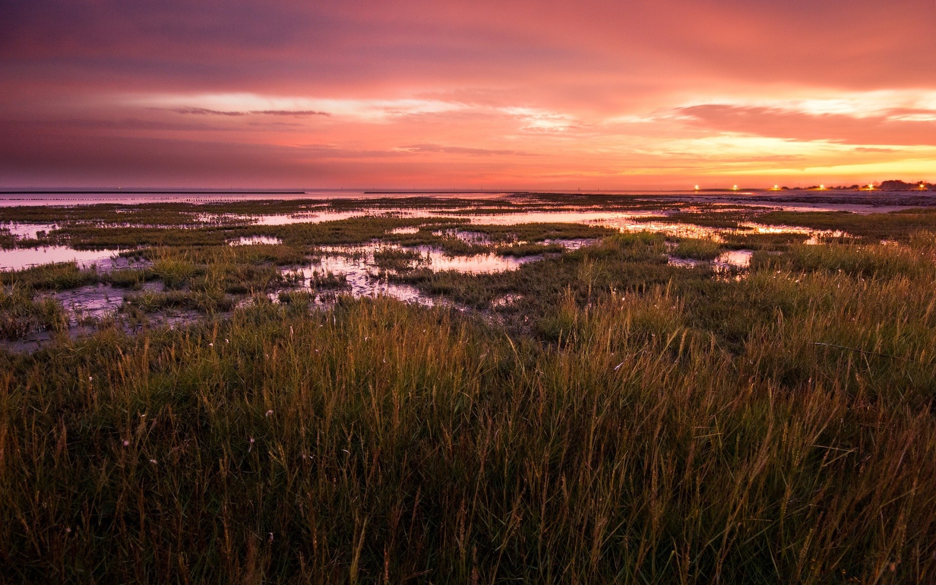 A cold sunset on an autumn swamp
