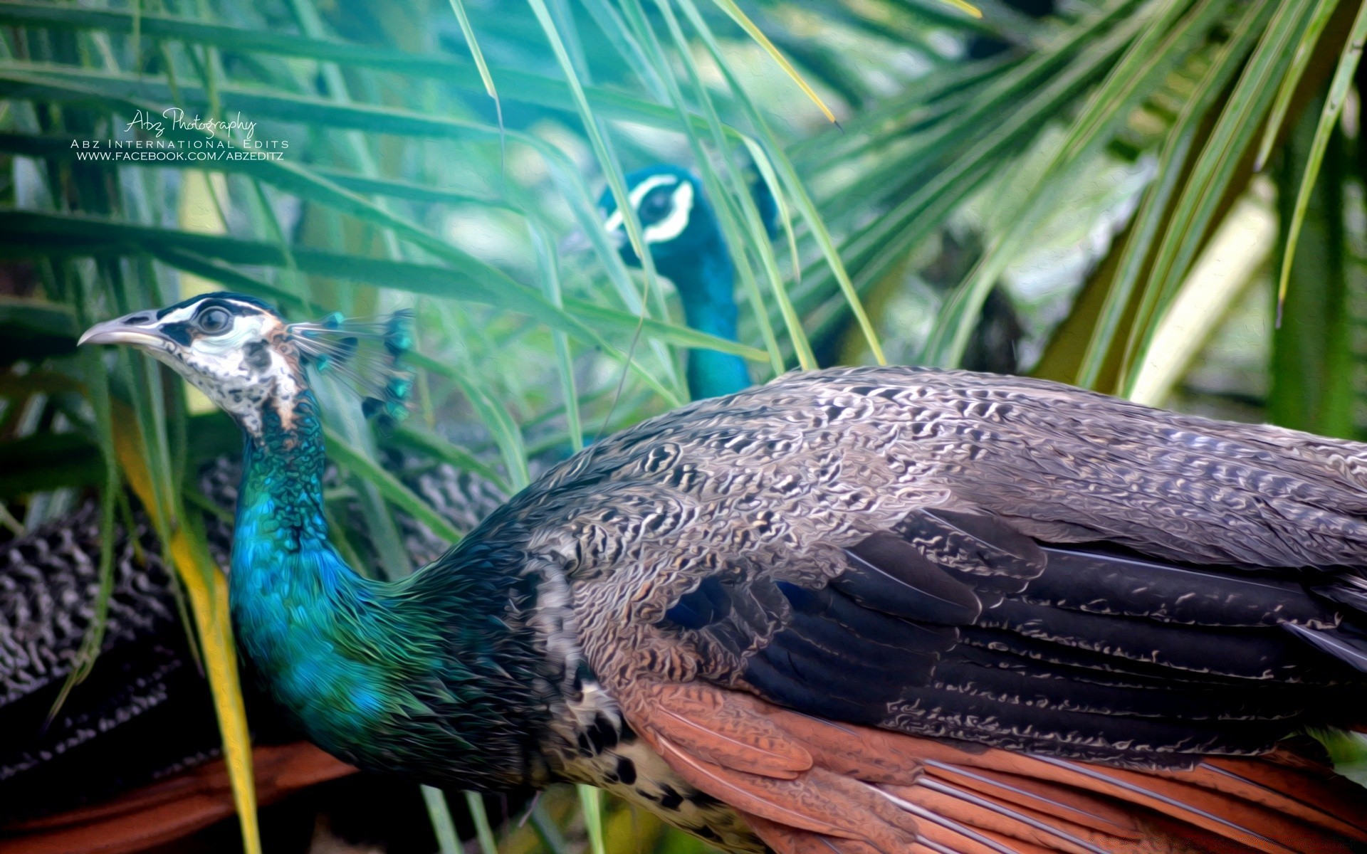 Palm trees, vegetation. Peacock in nature
