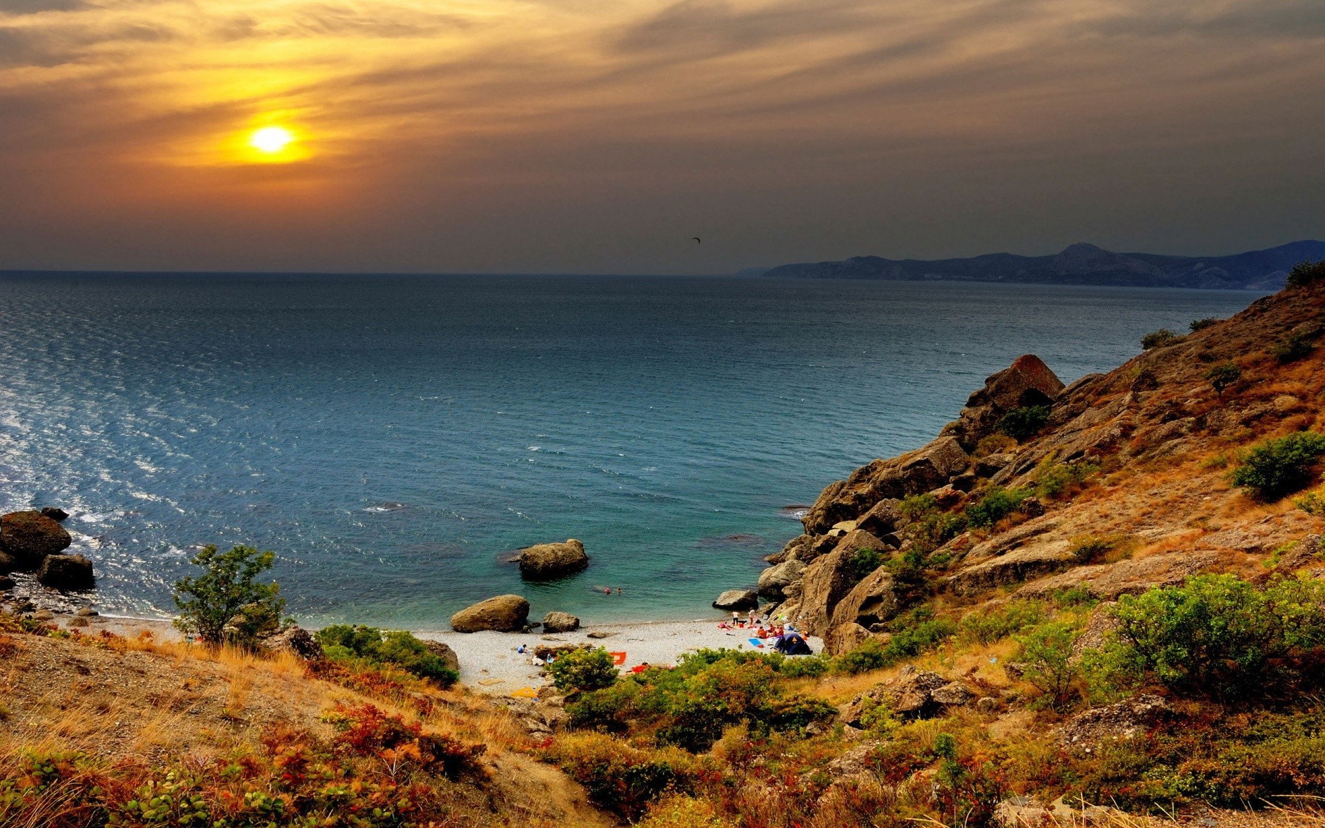 Pebble beach on the sea at sunset
