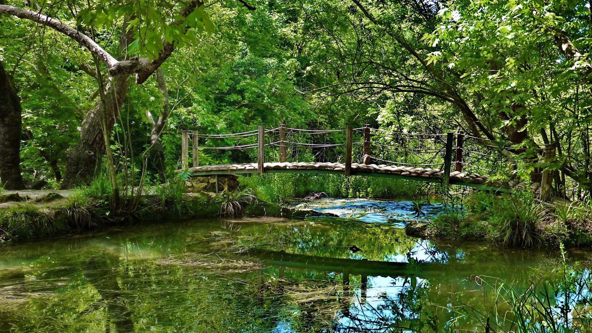 Metal bridge in the shape of an arch on the background of mountain peaks