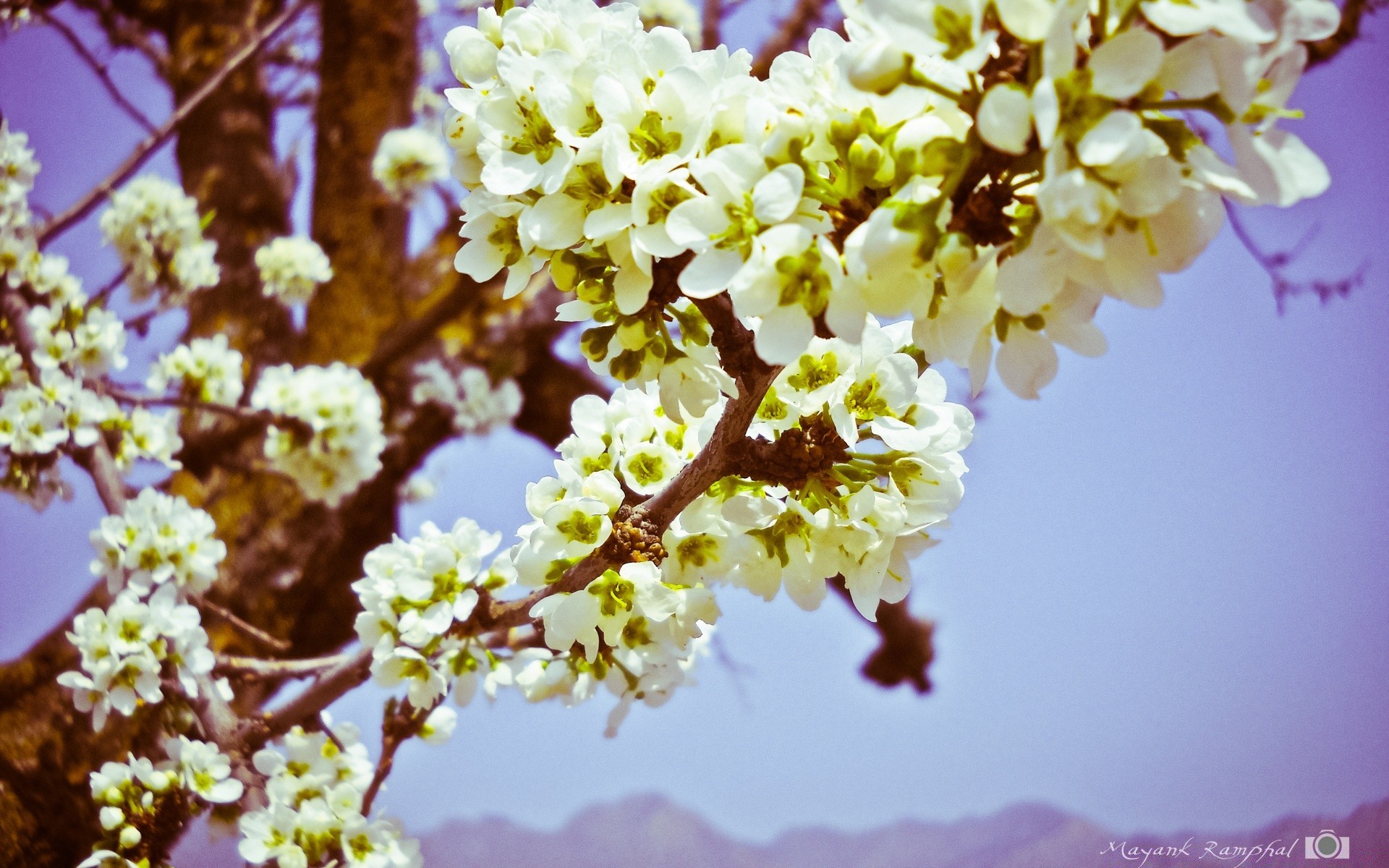 A twig with white flowers on the left