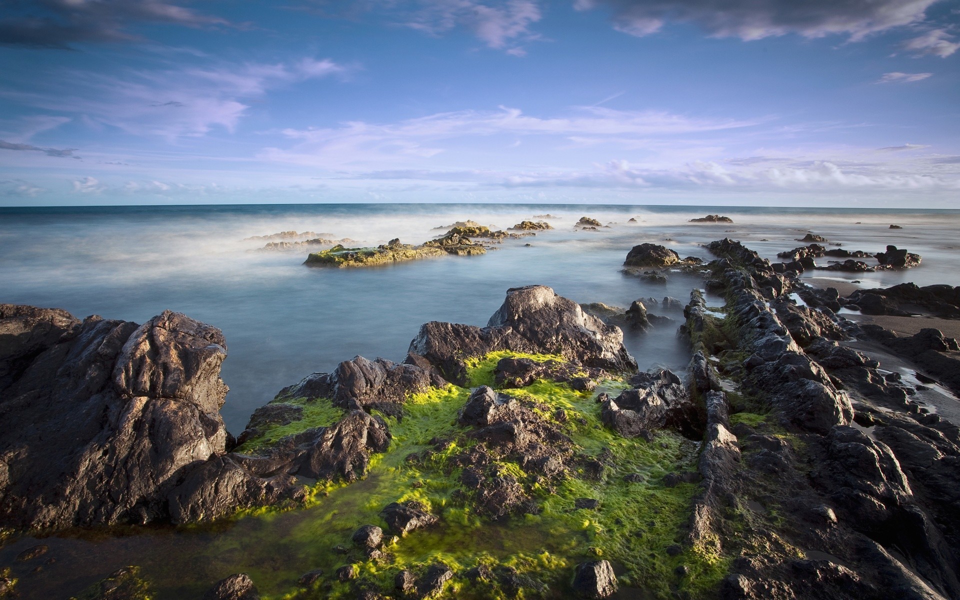 A beautiful sunset over a calm sea, the rays of the setting sun painted the surface of the water and clouds in golden color