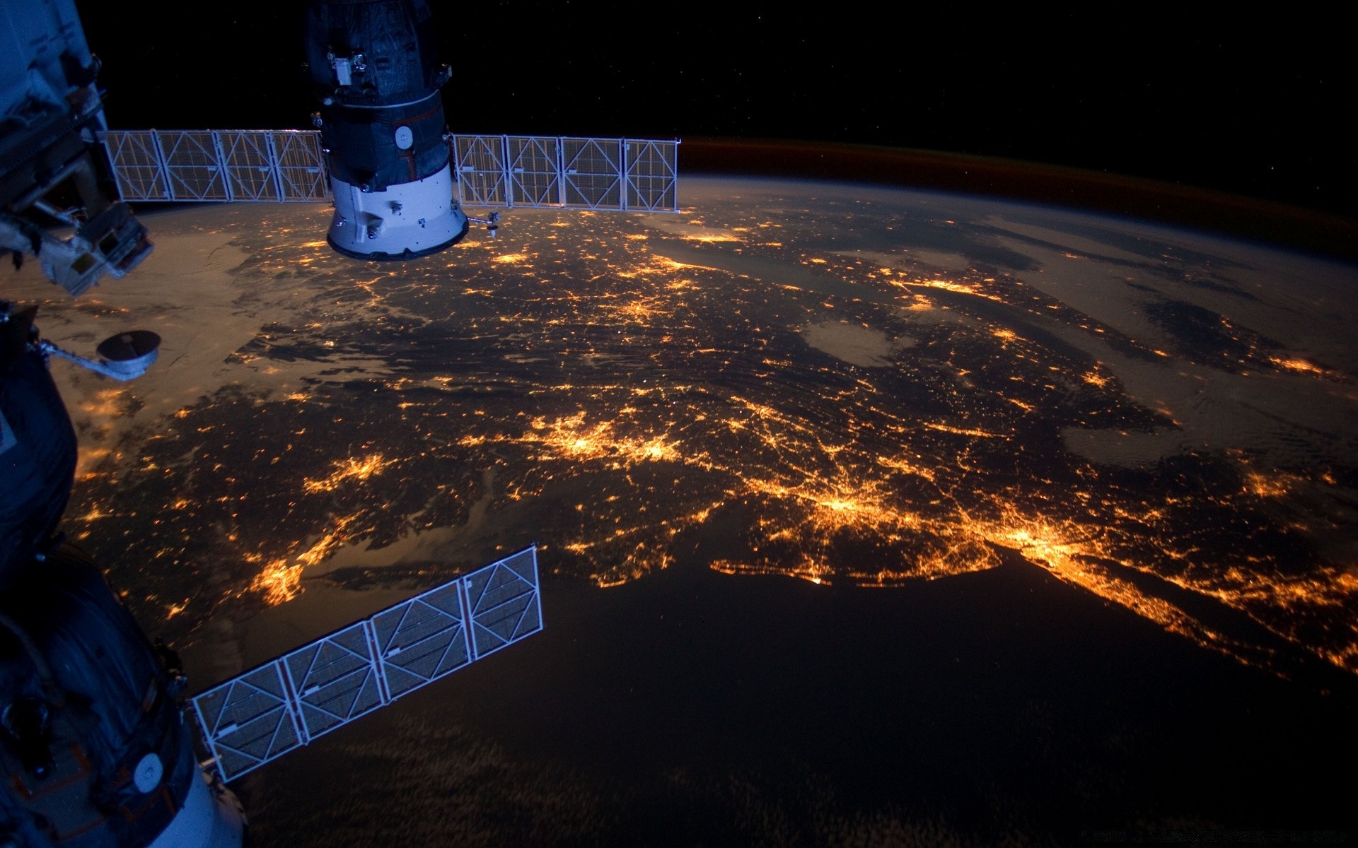 Spacecraft satellites on the background of the glowing moon