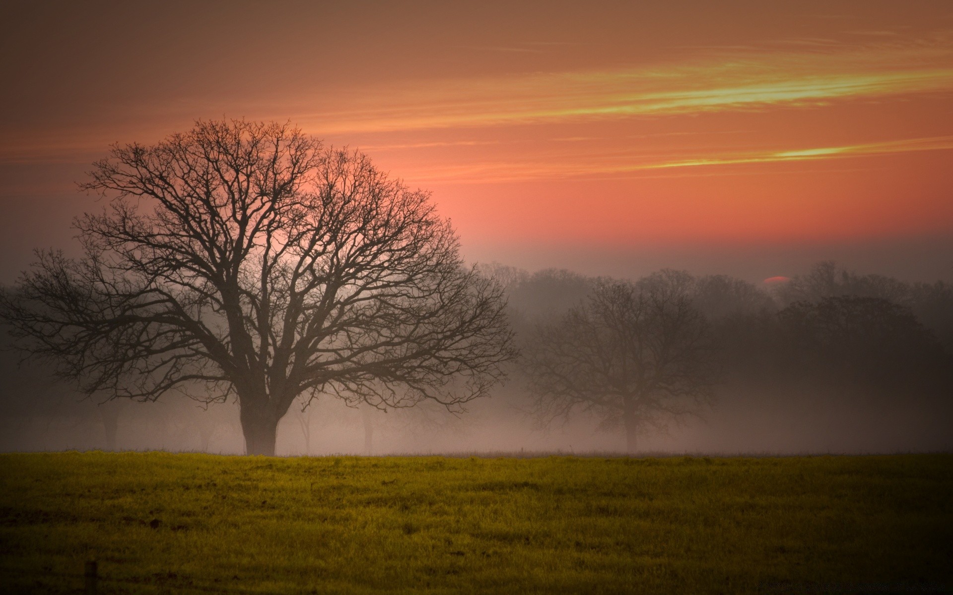 Trees with red leaves and the rays of the autumn sun breaking through the fog