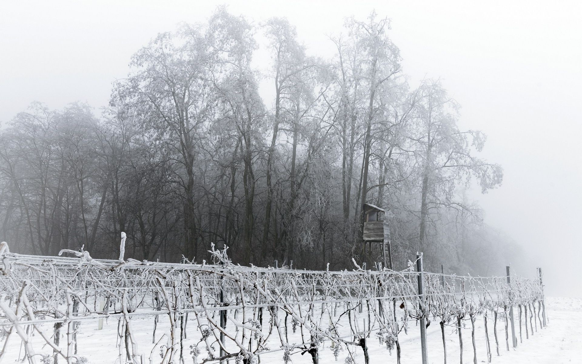 Snow-covered forest and railway tracks