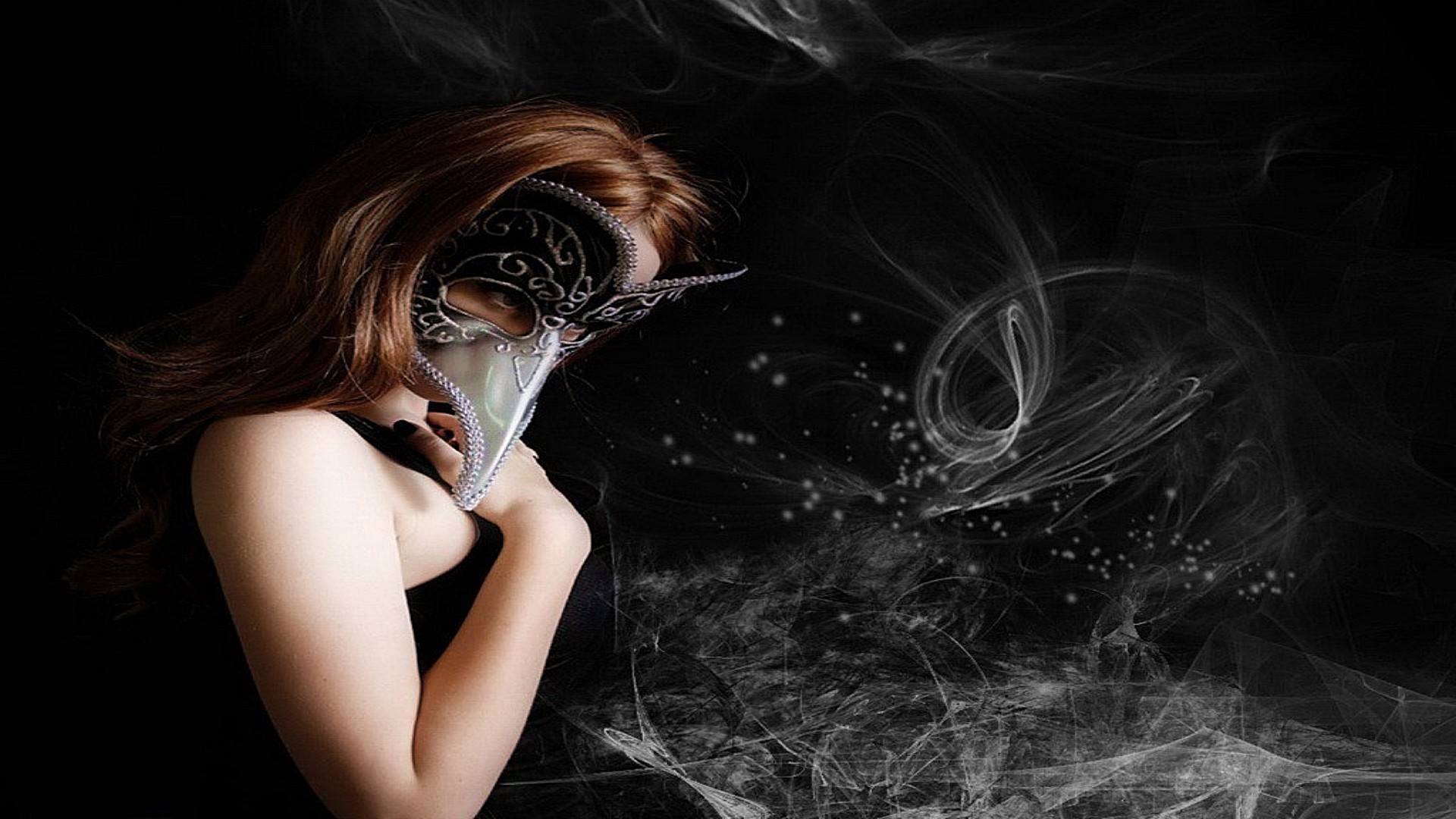 A woman in a raven mask on a black background