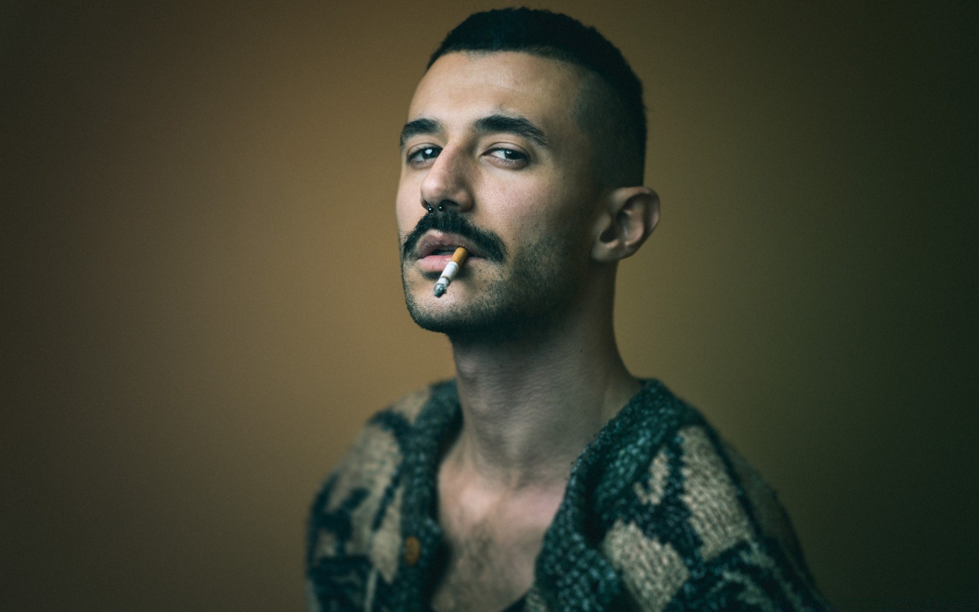 A mustachioed man with a cigarette