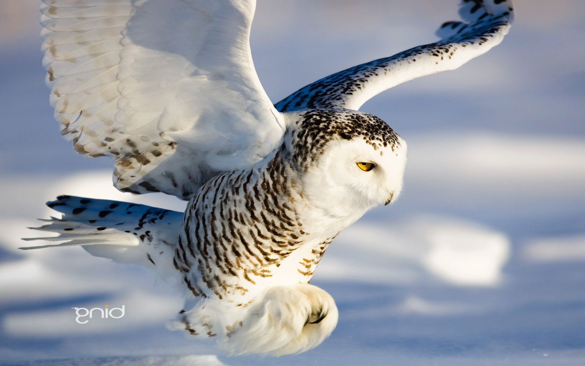 White owl in flight in winter