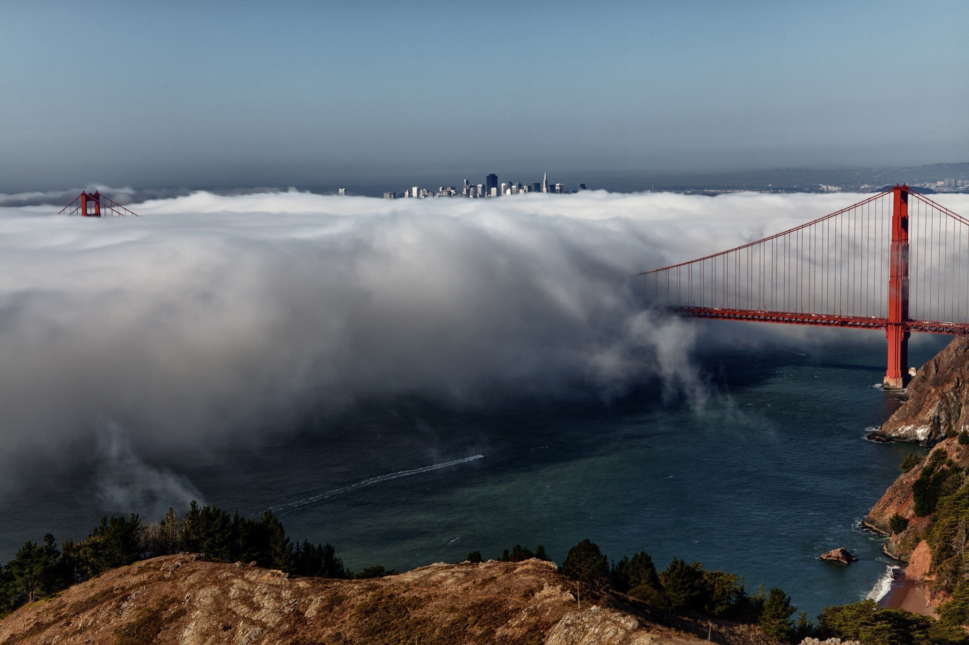 A bridge across the river connecting parts of the night city in lights against the background of a mountain in a white fog