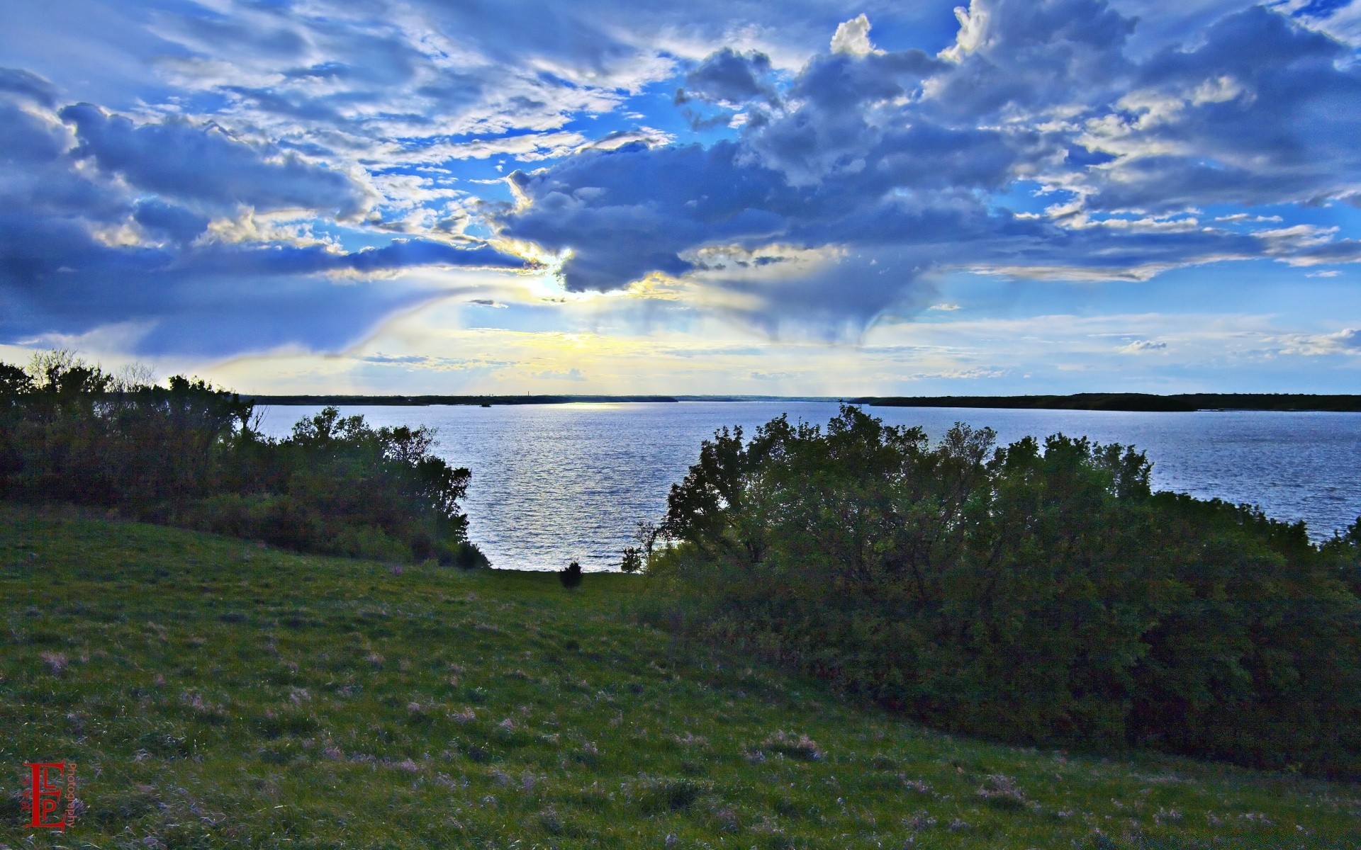 Sunset in the clouds over the lake view from the hill