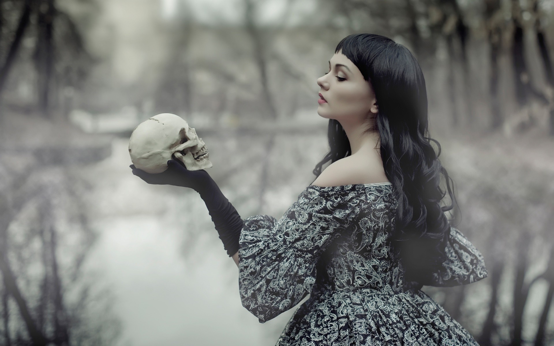 Gothic girl holding a skull in her hand