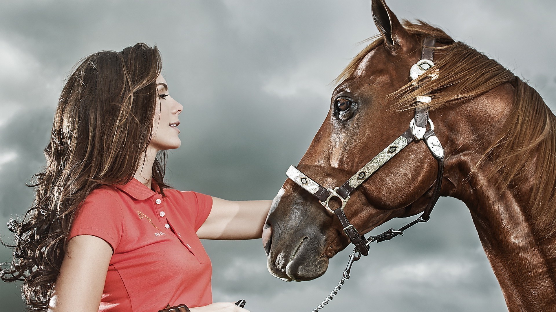 Portrait of a girl with a horse on a gray sky backgroundPortrait of a girl with a horse on a gray sky background