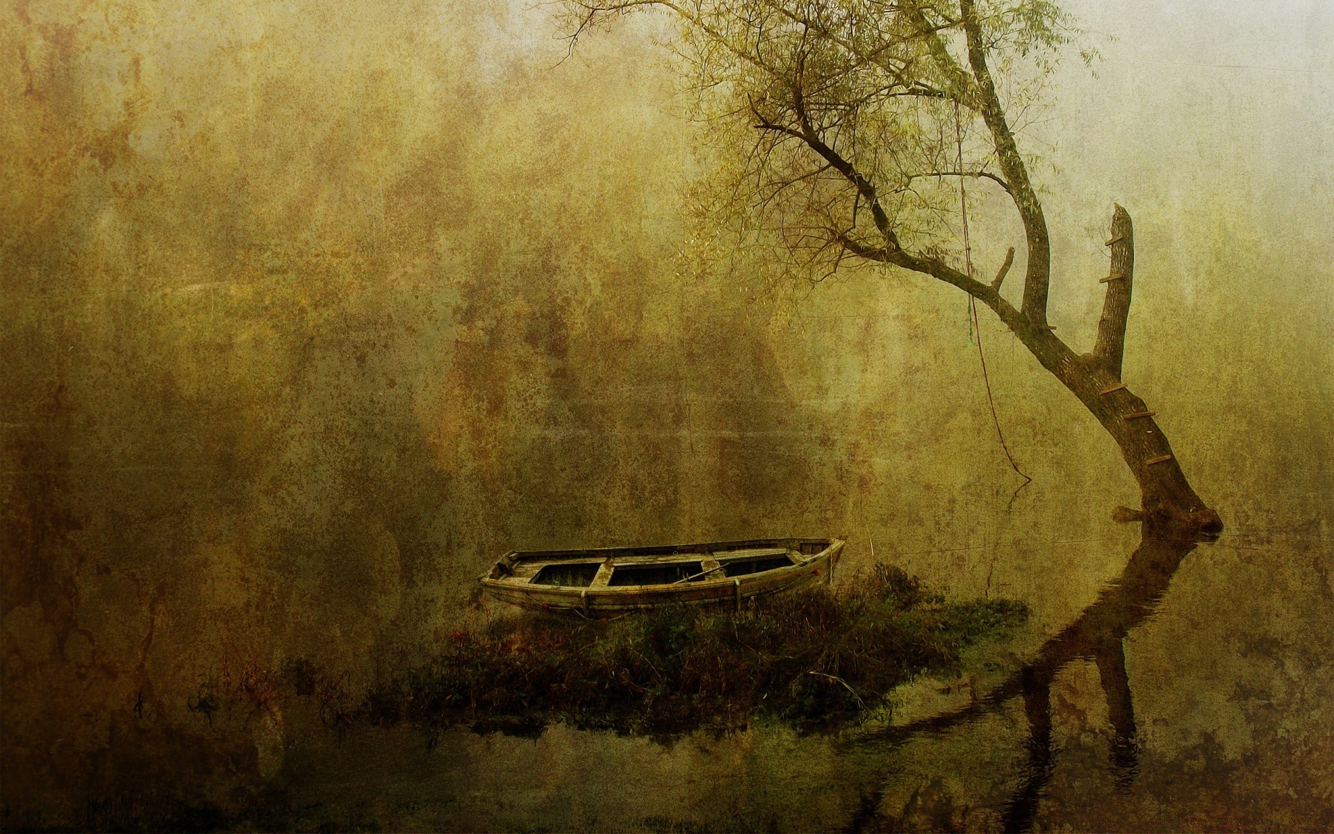 The rocky shore against the background of a clear sky is reflected in the waters of the river